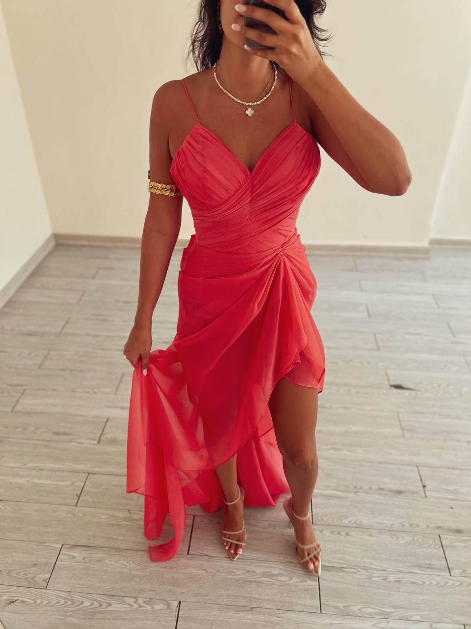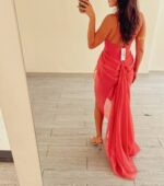 پیراهن رومی یقه Vبا دنباله حریر هندوانه ای