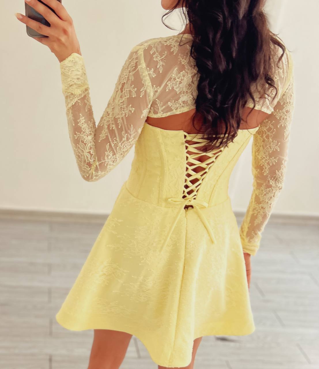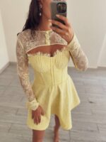 پیراهن کوتاه دامن کلوش بالاتنه کرست آستر دار رنگ زرد لیمویی با آستین و نیم تنه جدا