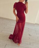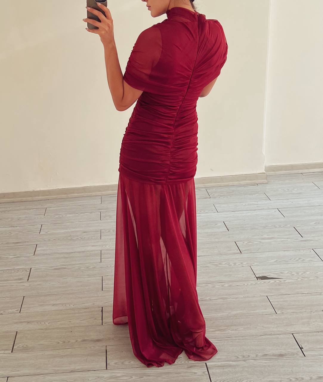 پیراهن ماکسی با دراپه های حریر کش رنگ زرشکی با یقه ریخته